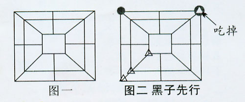 下三棋的玩法:首先在地上或石板上画一个棋盘(棋盘如图一),然后,甲乙双方各备12至15粒棋子,两种“棋子”不要相同,可用小石子或瓦片,可用柴枝或纸团。接着是往棋盘放棋子。谁先放都行,对方同意即可。甲放一个,乙随着放一个(见图二)。当一方的棋子3个成一直线时,便可吃掉对方刚放下的任何一个棋子,直到把棋盘的棋子位放完为止,全盘每人放11个棋子。开始行棋前,把双方被吃掉的棋子拿掉,就可以由慢放棋子的一方先走第一步棋,这一步要走出3个棋子成一直线来,便可以吃掉对方任何一个棋子,破坏对方将成为3个棋子成一直线的棋局,这样轮流下去,直到把对方的棋子吃剩2个棋子为上,剩下棋子多的一方为胜。