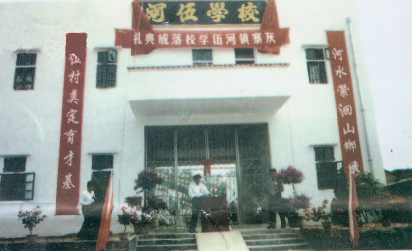 镇初级中学校舍落成后,老校舍归还河伍小学。1995年村里决定改建旧校舍,这个决定得到广大村民和旅外乡亲、侨胞的拥护和支持,乡亲们踊跃捐款,马来西亚乡亲李耀章先生捐12万元,大慈善家、拿督李景春先生捐5万元、李建南先生捐3万元,旅外侨胞共捐28万元,国内乡亲捐27万元,村集体筹集20多万元,共筹集资金75万多元,建起3层教学楼10间教室,1000多平方米;教师宿舍2层6间,300多平方米;校门等建筑面积共1500多平方米,还建设了体育活动场所等配套设施2300多平方米。